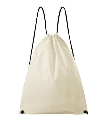 Rucsac din pânză neţesută. Două şnururi negre din poliester. Colţurile întărite cu un strat suplimentar de material şi inele de metal. Cusături laterale. Etichetă detaşabilă.